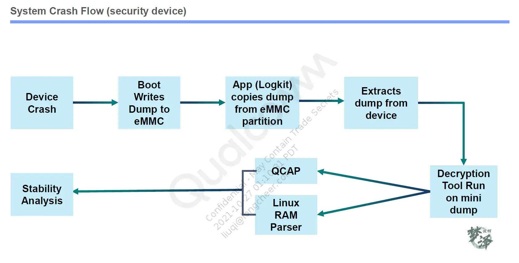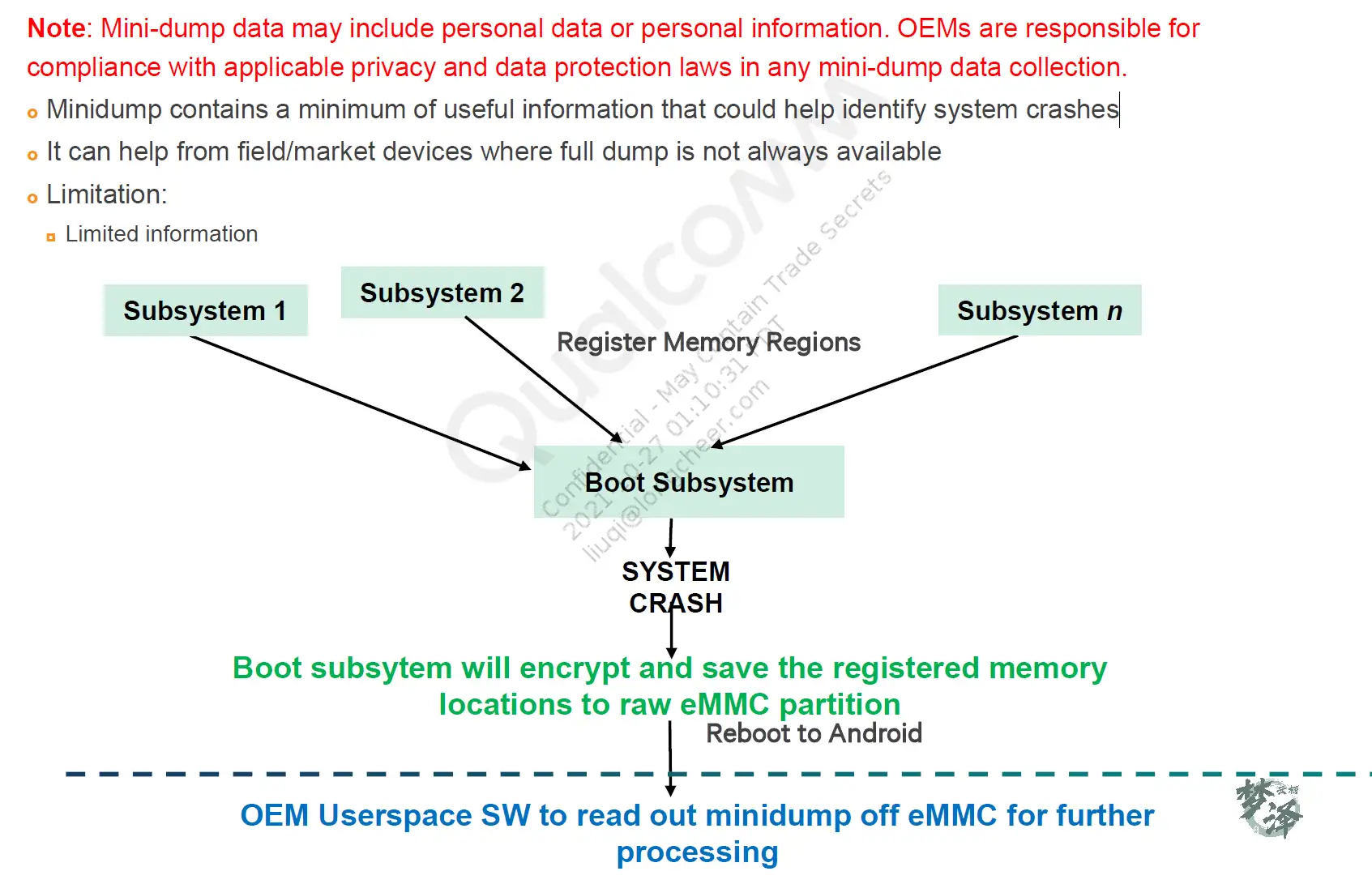 各个subsystem 都会注册在 memory 映射表中,当system 发⽣crash的时候,boot subsystem 会去加密并保存注册过的memory信息,保存到RAM EMMC 分区