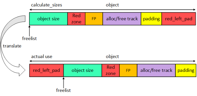 red_left_pad和Red zone的作用一致。都是为了检测oob。区别就是Red zone检测right oob,而red_left_pad是检测left oob。如果仅仅看到上面图片中object layout。你可能会好奇,如果发生left oob,那么应该是前一个object的red_left_pad区域被改写,而不是当前object的red_left_pad。如果你注意到这个问题,还是很机智的,这都被你发现了。为了避免这种情况的发生,SLUB allocator在初始化slab缓存池的时候会做一个转换。