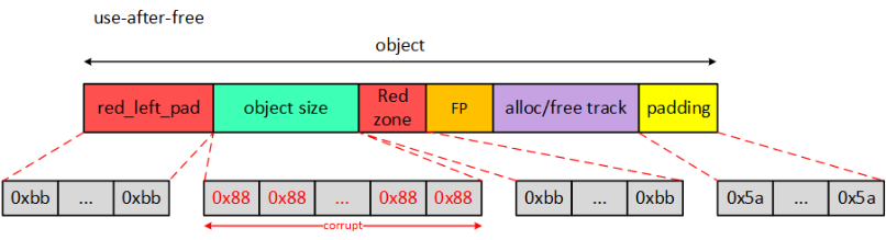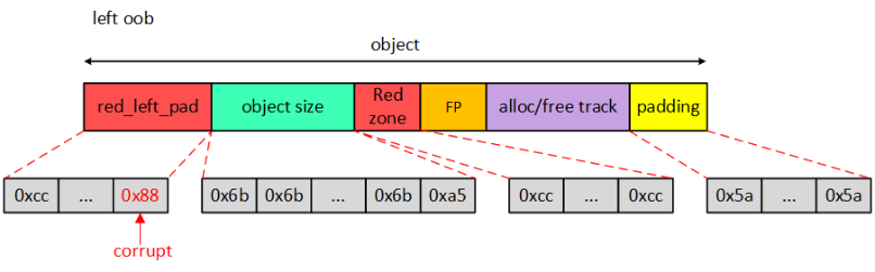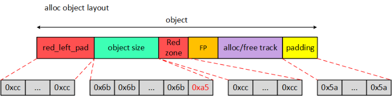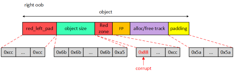 从图中我们可以看到在object后面紧接着就是Red zone区域,那么Red zone有什么作用呢?既然紧随其后,自然是检测右边界越界访问(right out-of-bounds access)。原理很简单,在Red zone区域填充magic num,检查Red zone区域数据是否被修改即可知道是否发生right oob。