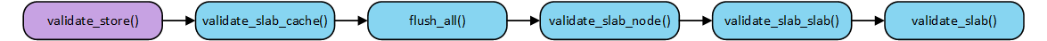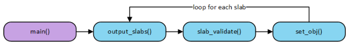 我们看一下slabinfo –v命令的实现方式以及检查的流程。slabinfo源码位于tools/vm/slabinfo.c文件。slabinfo –v命令执行流程如下图所示。